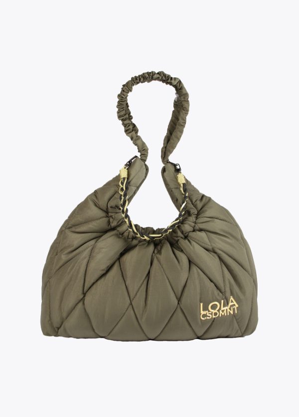 Bolso tipo shopper acolchado con asa trenzada de cordones extraíble. Cierre con botón imantado y logo dorado en parte frontal.