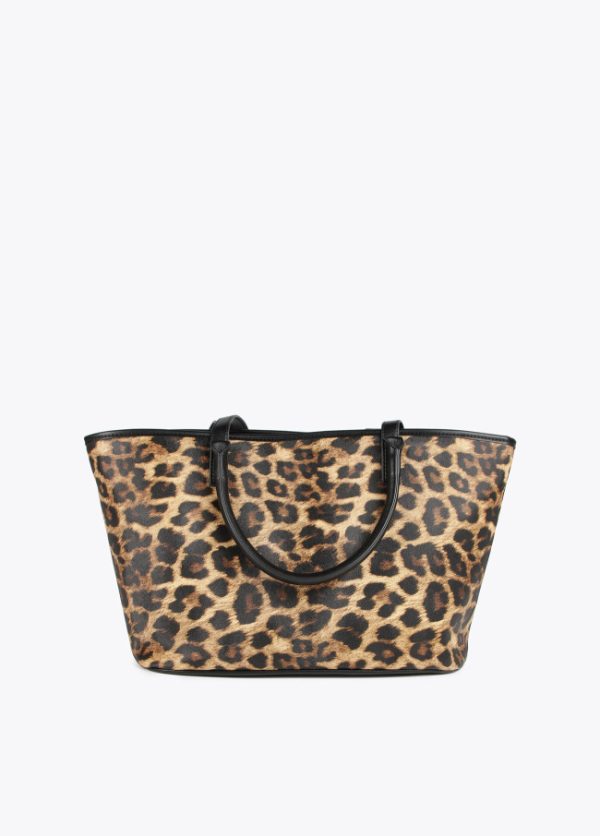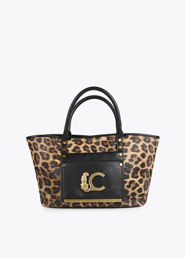 Bolso tipo shopper en efecto piel y animal print. Logo animal dorado en parte frontal. Asas de hombro y asas de mano y bolsito neceser interior con cremallera.