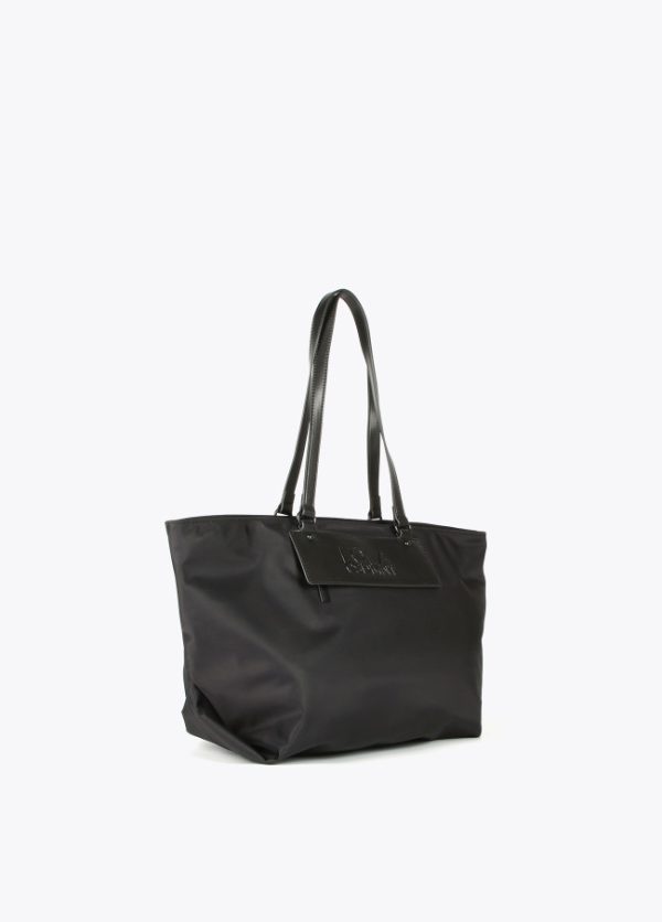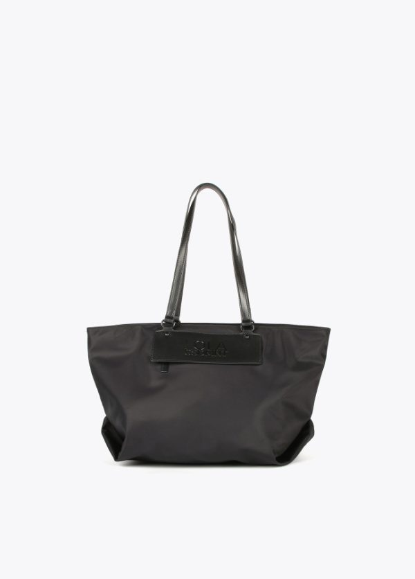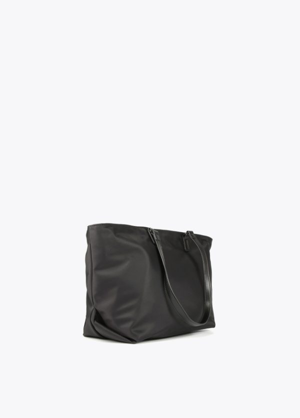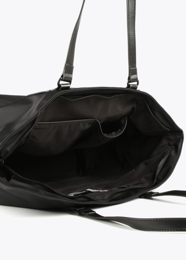 Bolso tipo shopper en efecto piel y nylon combinada. Bolsillo en parte delantera con cierre central de cremallera. Asas de hombro y asa bandolera logotipada.