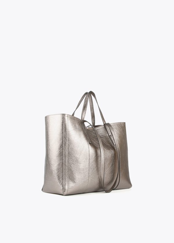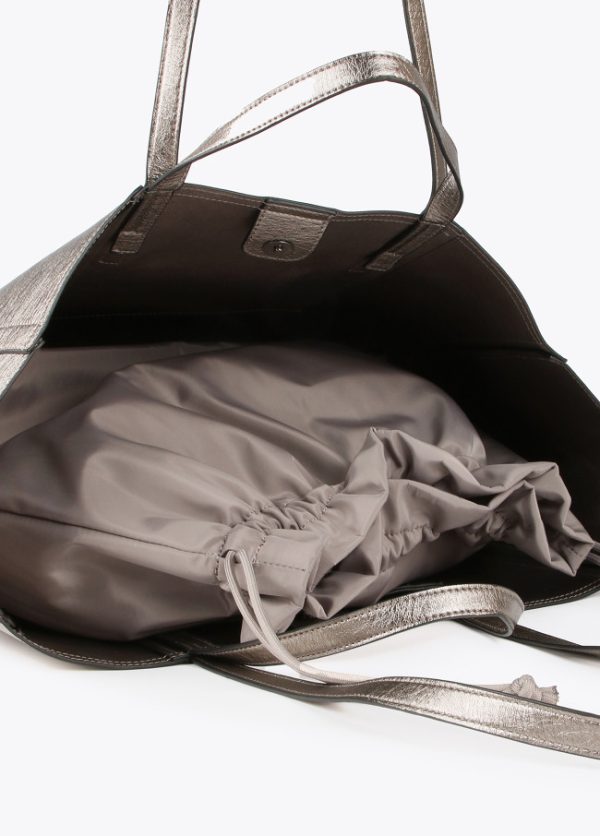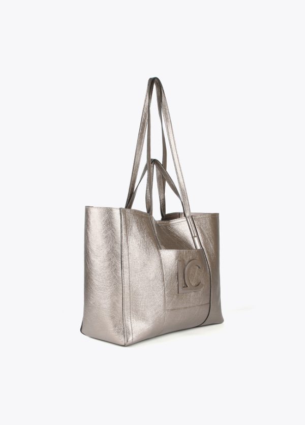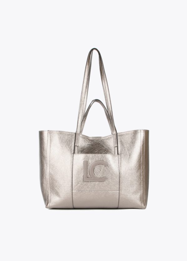 Bolso tipo shopper metalizado con mega logo al tono en parte frontal. Asas de mano y asas de hombro. Saco interior con cierre ajustable.