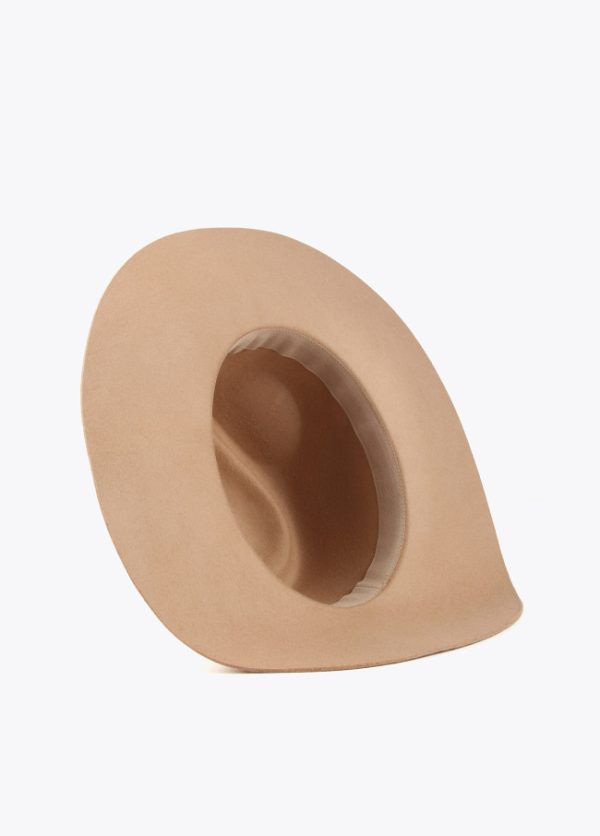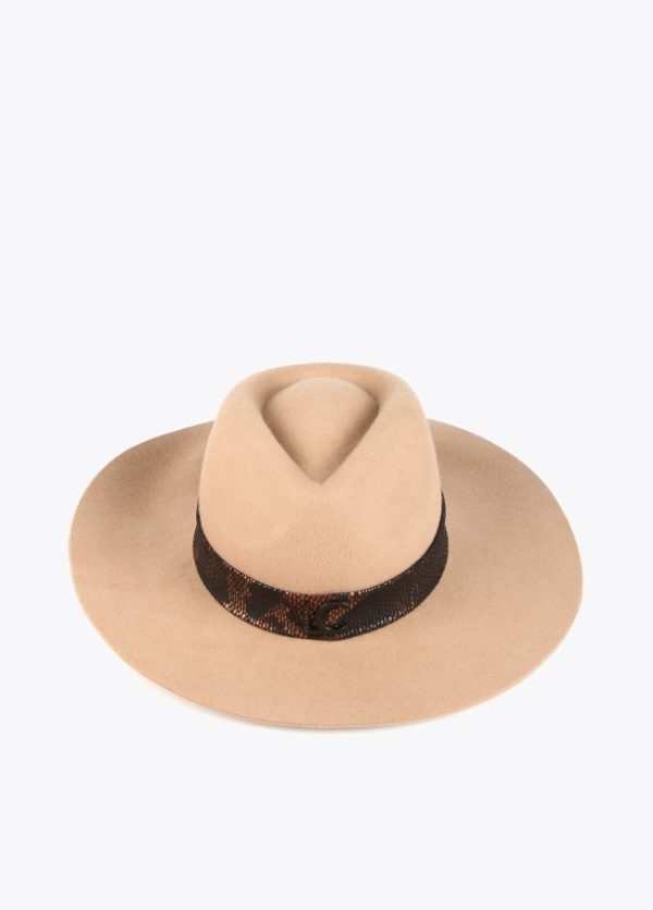 Sombrero de fieltro de lana con cinta animal print metalizada. Letras logo lacadas en parte frontal.