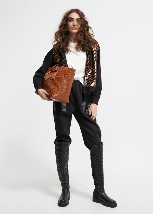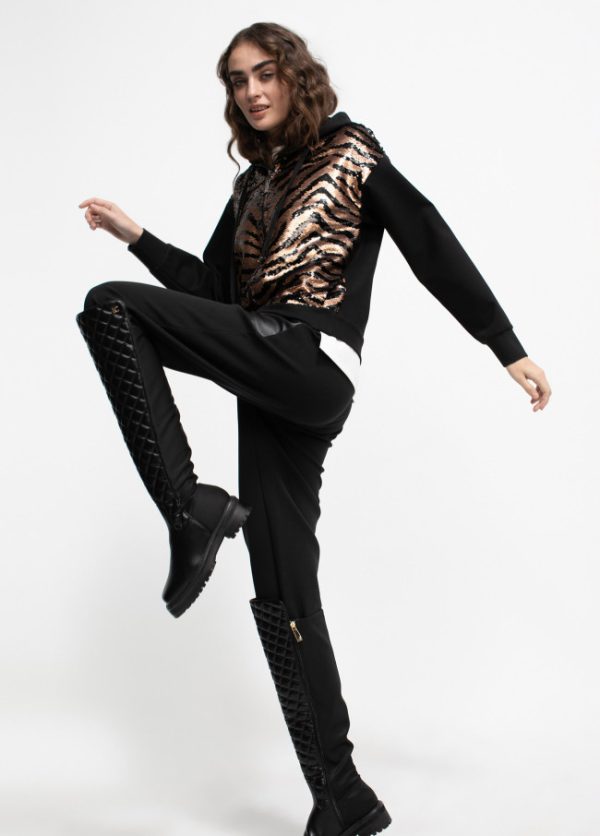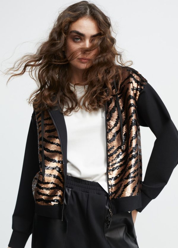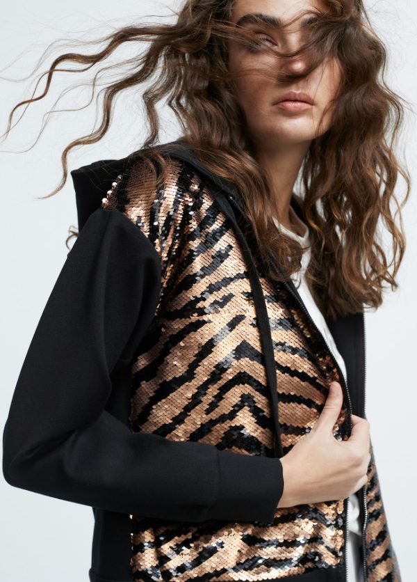 Sudadera con capucha. Frontal en lentejuela estampado animal print. Cierre con cremallera de doble carro. Bolsillos laterales.