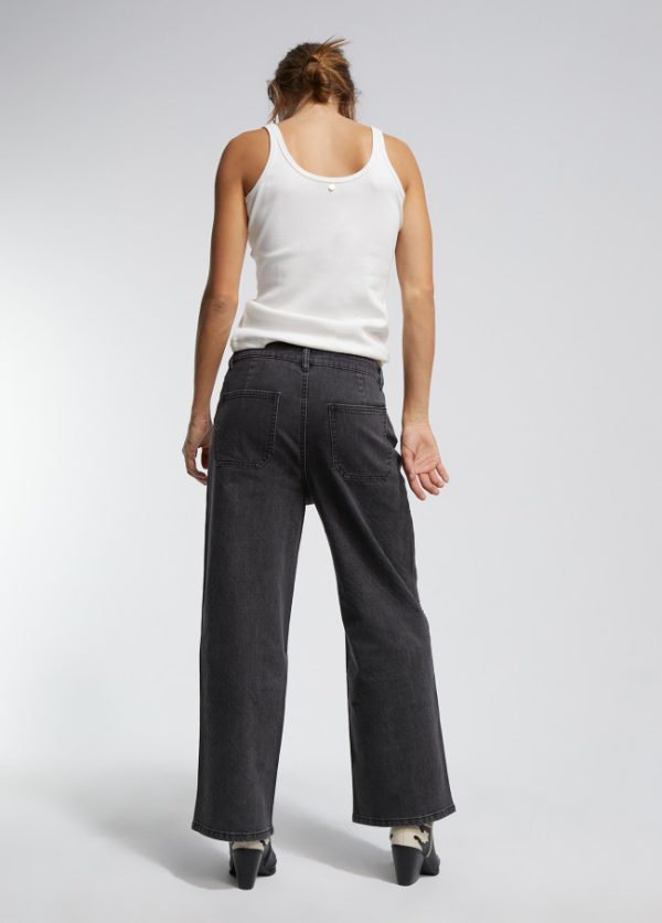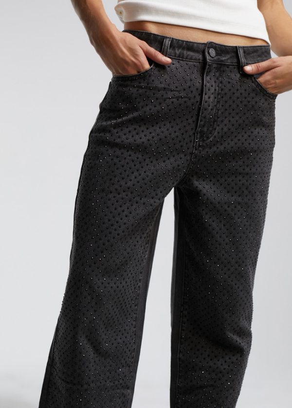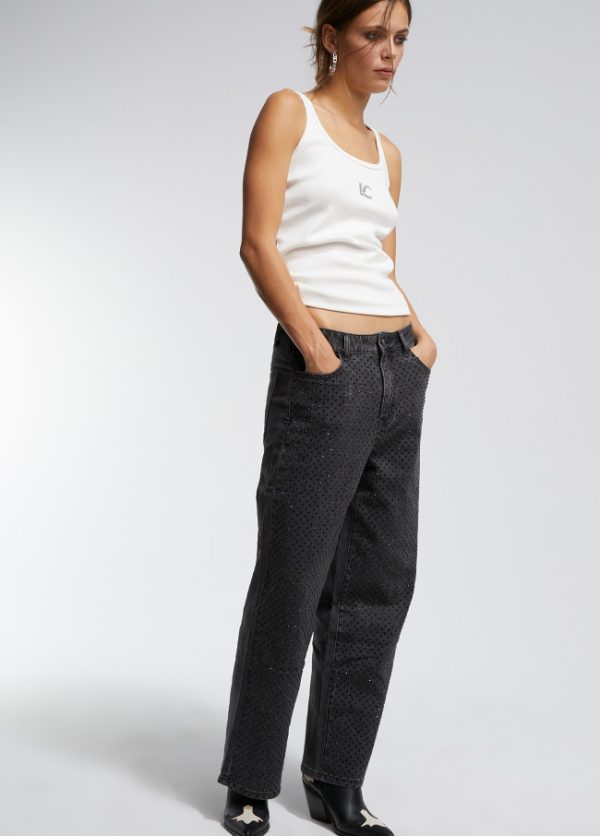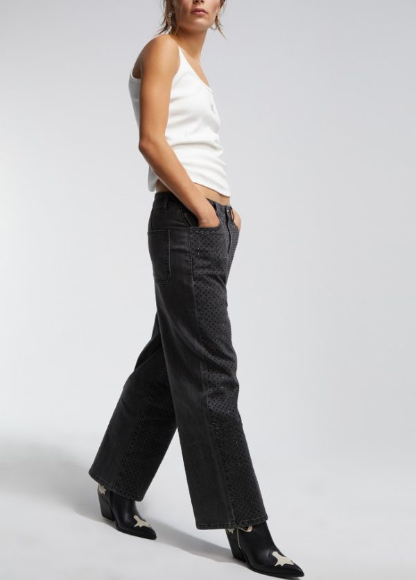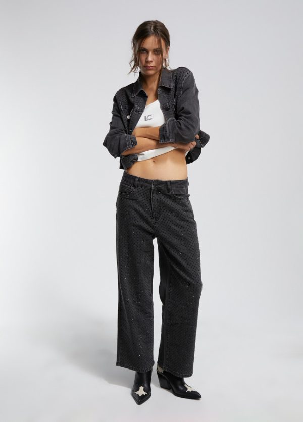 Tejano tipo wideleg con strass a tono. Cintura con trabillas. Cierre con cremallera frontal y botón metálico.