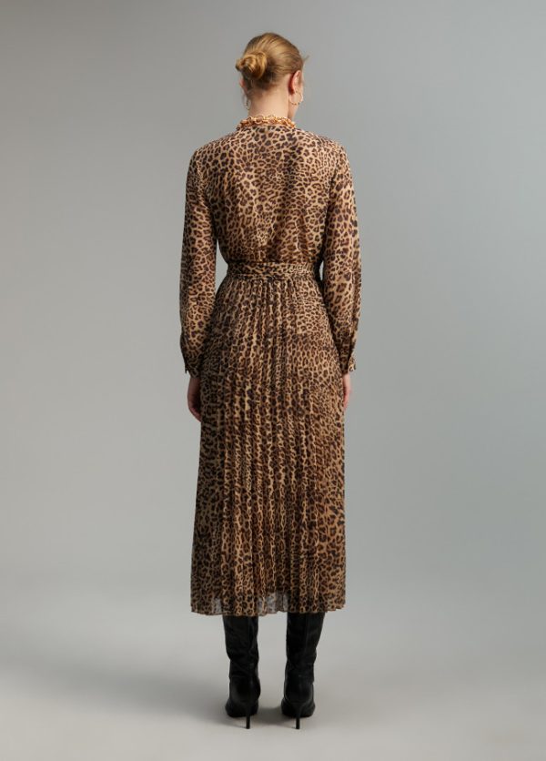 Vestido en estampado animal print. Cuello caja y escote abierto. Cinturón del mismo tejido. Falda plisada de largo midi.