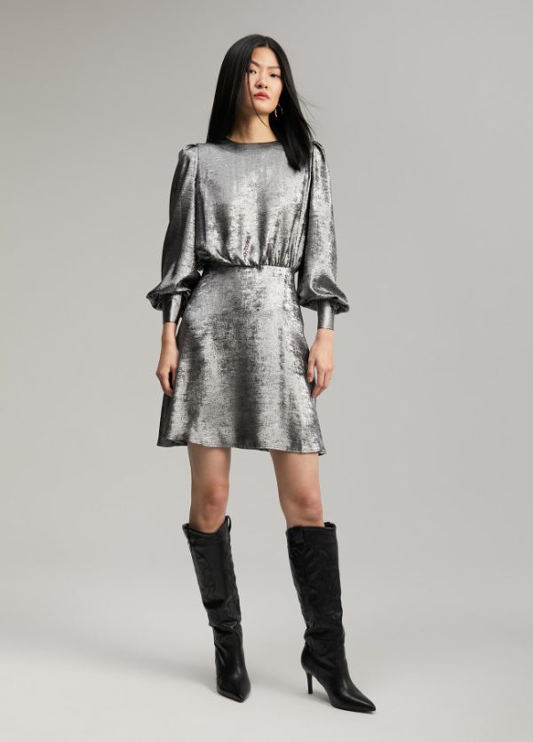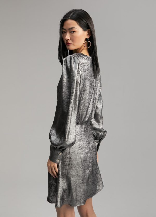 Vestido corto de cuello caja y manga ligeramente abollonada. Corte en cintura. Tejido efecto laminado.