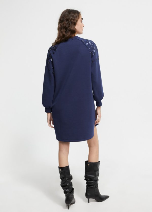 Vestido corto. Cuello caja. Frontal con detalle en lentejuelas a tono. Manga con puño. Bajo asimétrico con aberturas.