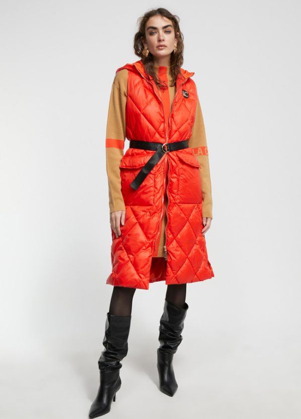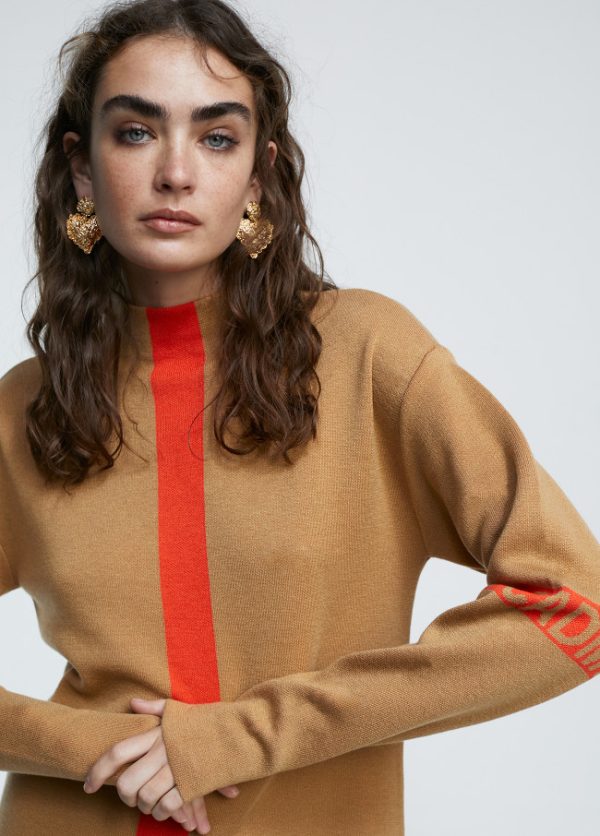 Vestido corto de punto. Cuello perkins. Detalle a contraste en banda frontal y logo en manga.