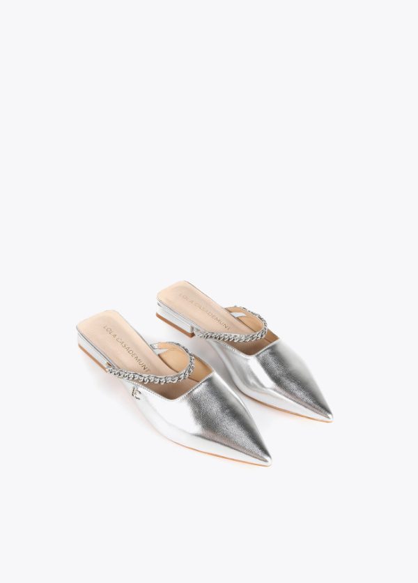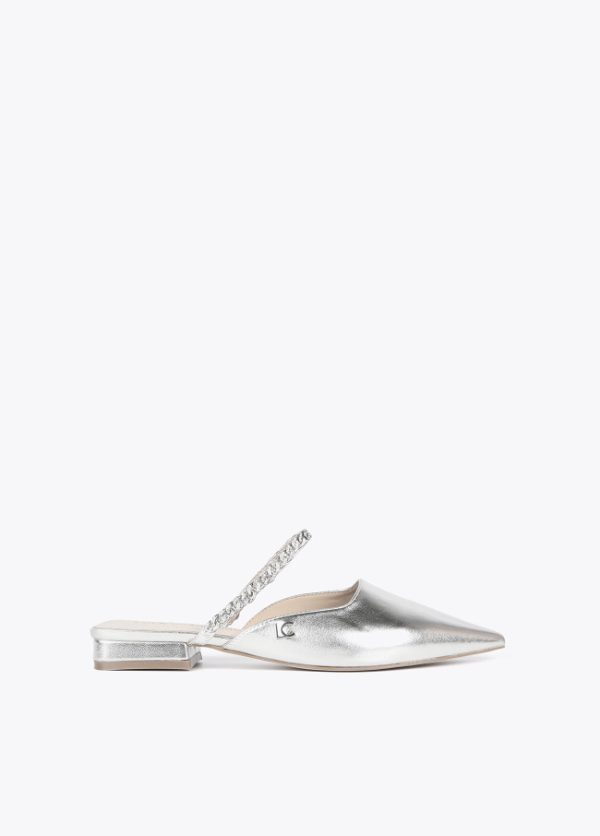 Zapato plano destalonado con punta y tira de pedrería en zona empeine. Suela logotipada y letras logo en laterales.