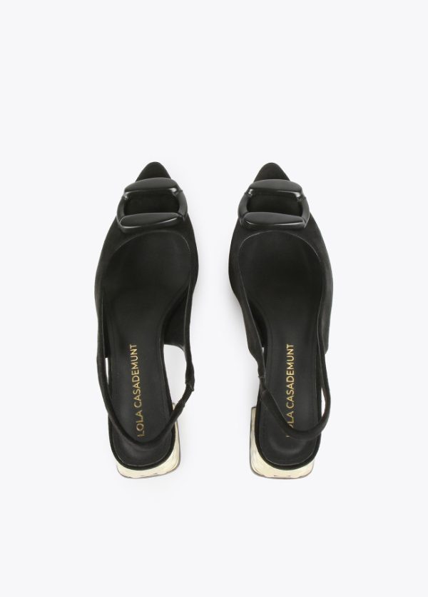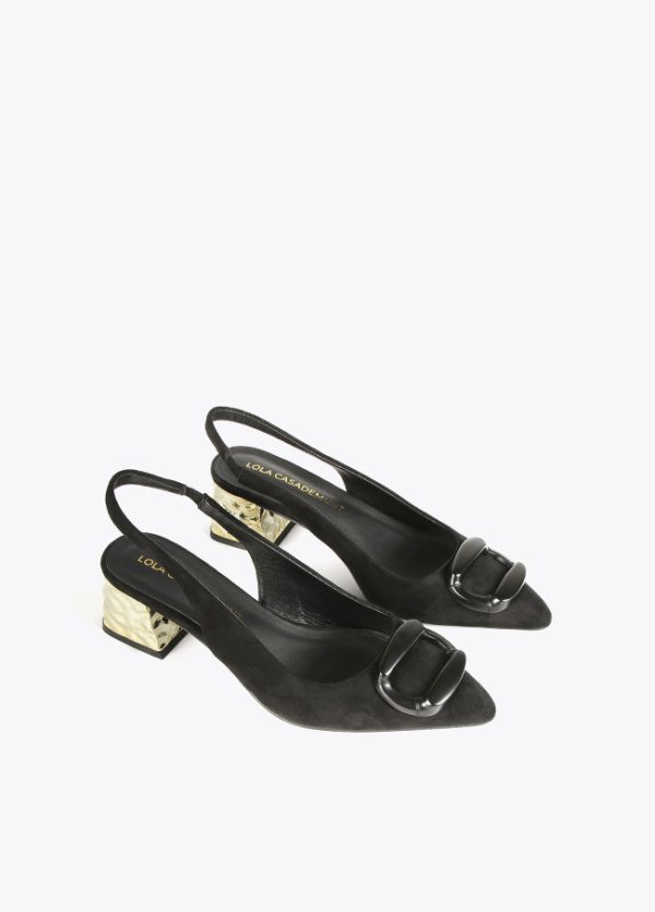 Zapato tipo salón abierto en efecto terciopelo con tacón medio dorado y grabado. Detalle hebilla en parte superior y plantilla logotipada.